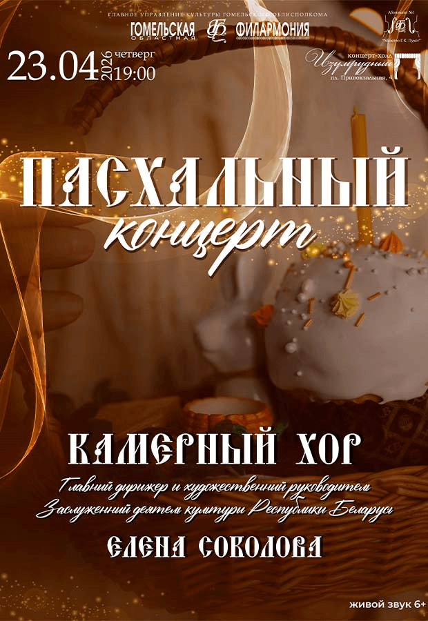 Камерный хор Гомельской областной филармонии приглашает жителей и гостей города на особенный музыкальный вечер. Пасхальные концерты коллектива стали уже доброй традицией в культурной жизни г. Гомеля. Тем не менее, слушатели не устают восхищаться необычной интерпретацией, удивительной красотой, гармонией и проникновенностью исполнения.