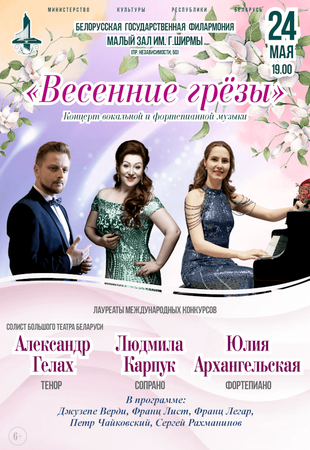 25 апреля в Малом зале им. Г.Ширмы Белорусской государственной филармонии состоится концерт вокальной и фортепианной музыки «Весенние грёзы», который подарит столичной публике уникальную возможность услышать в одной программе великолепных солистов в уютной атмосфере камерного зала, – лауреатов международных конкурсов Людмилу Карпук (сопрано), Юлию Архангельскую (фортепиано) и солиста Большого театра оперы Беларуси Александра Гелаха (тенор)