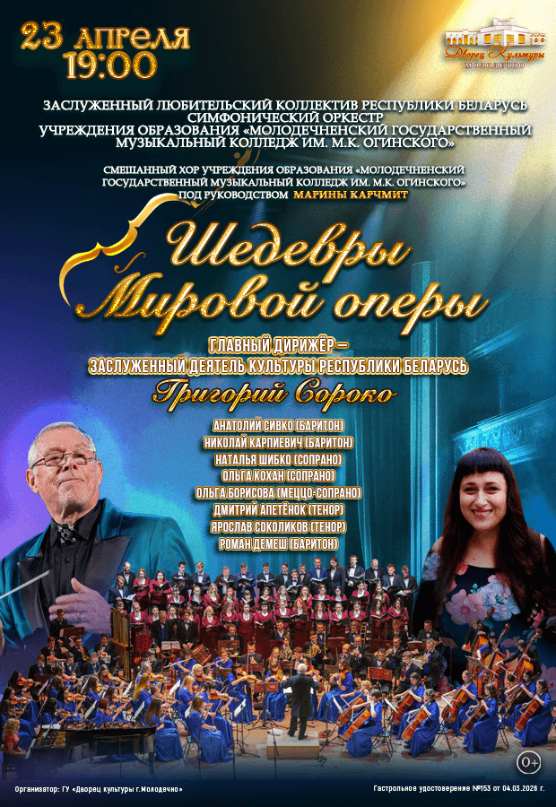 Концертная программа «Шедевры мировой оперы» пройдёт во Дворце культуры г. Молодечно 23 апреля.