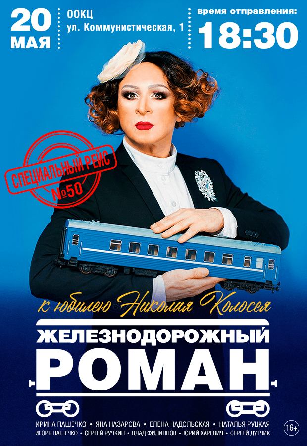 «ЖЕЛЕЗНОДОРОЖНЫЙ РОМАН» - музыкальный спектакль, поп-мюзикл, в котором звучат самые любимые поп-хиты разных лет: от 80-х и 90-х (из репертуара гр. Руки вверх, Александра Серова, Андрея Губина, Татьяны Булановой и других) до самых современных (из репертуара гр. Комната культуры, Григория Лепса, Анны Асти, гр. Инь-Ян и других).
