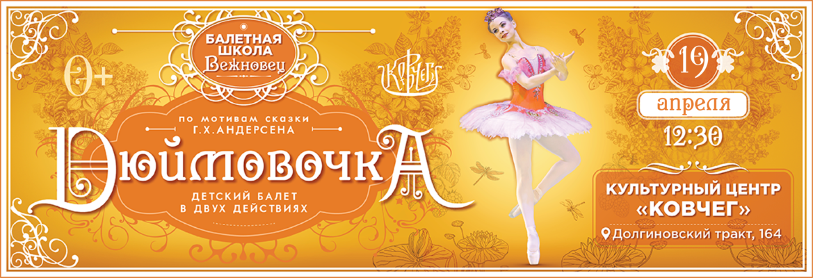 19 апреля в КЦ «Ковчег» в Минске «Балетная школа Вежновец» представит детский балет-сказку «Дюймовочка». Яркая постановка с красочными декорациями и костюмами объединит на сцене около 60 юных артистов в возрасте от 4 до 10 лет.