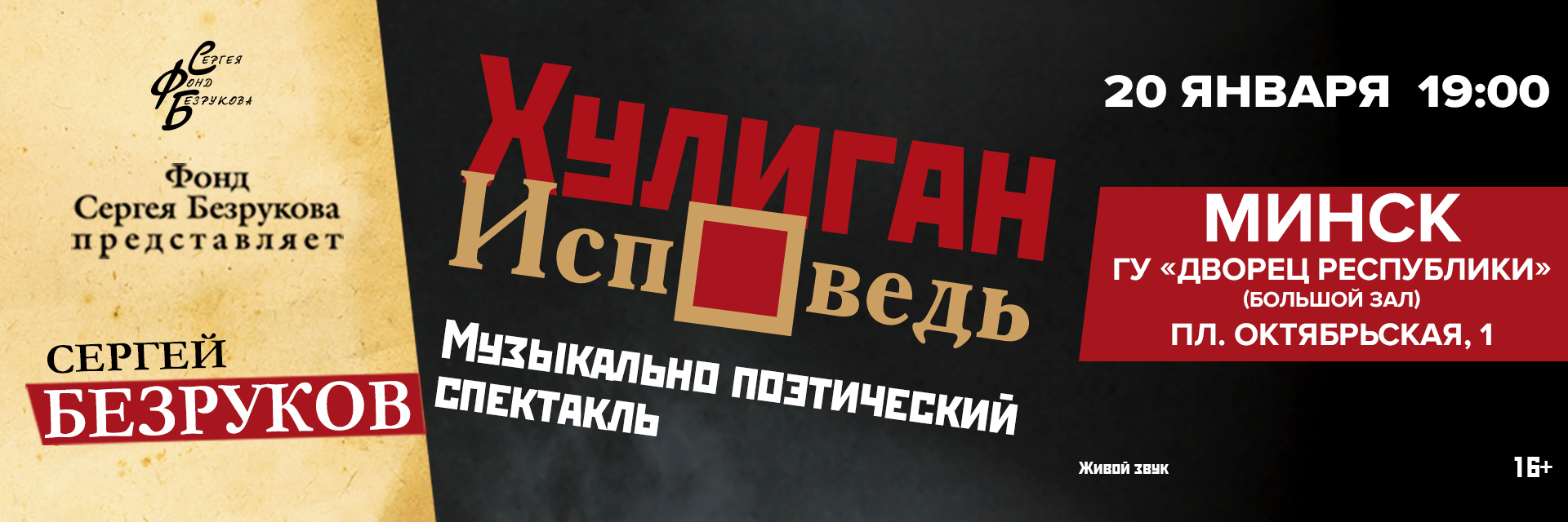 | Мероприятие | Спектакль "Хулиган. Исповедь" с участием Сергея Безрукова |